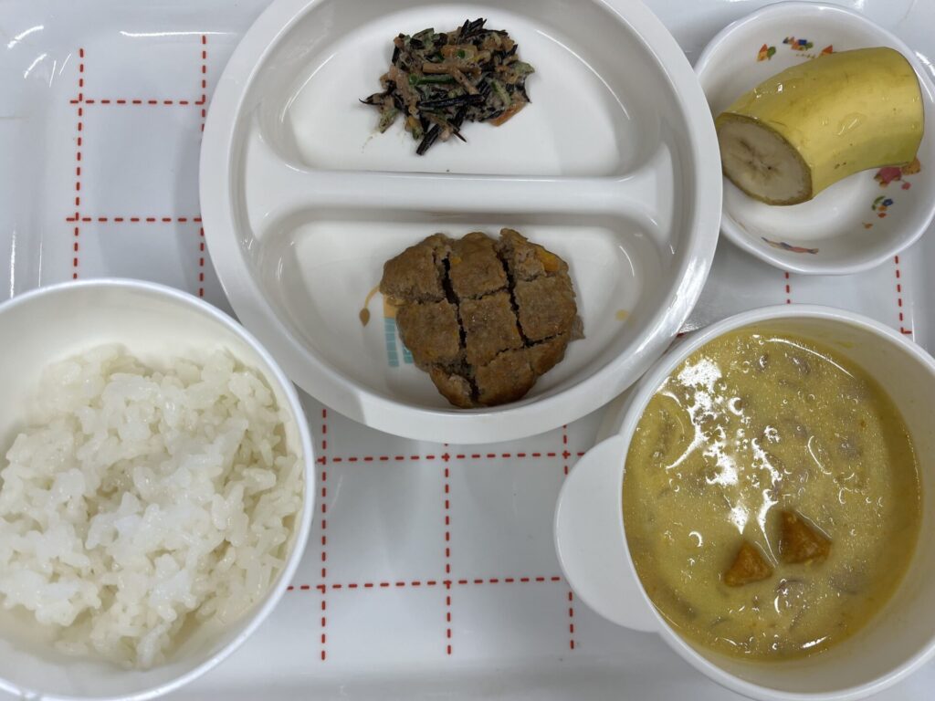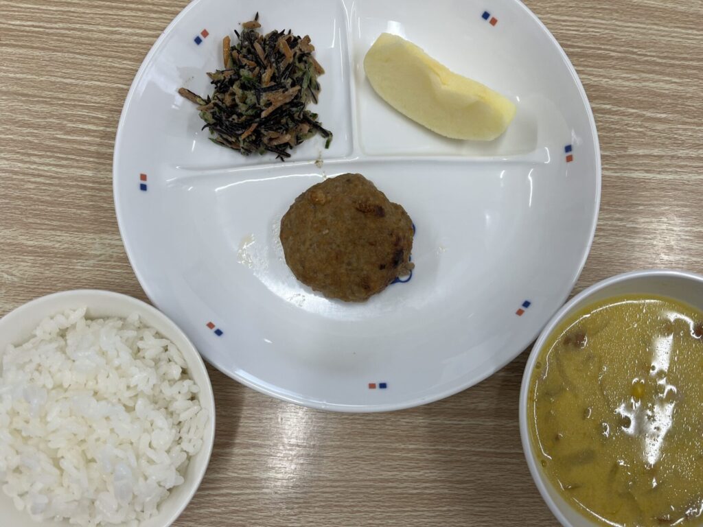 かんべ幼稚園 今日の給食🥢 2025.11.05 ≪11月5日(水)の献立≫・ごはん・ハンバーグ・ひじきのゴマネーズ・かぼチャウダー・りんご(未満児さん:バナナ)★おやつ…マドレーヌ 2歳児 3歳~5歳児 おやつ(マドレーヌ)