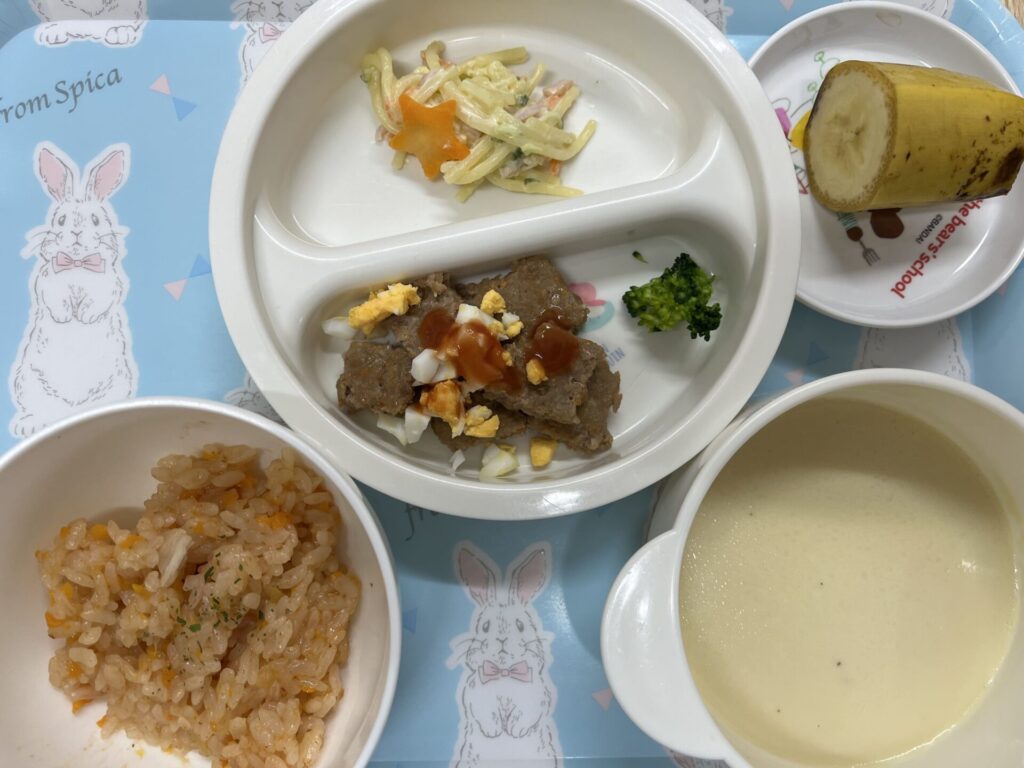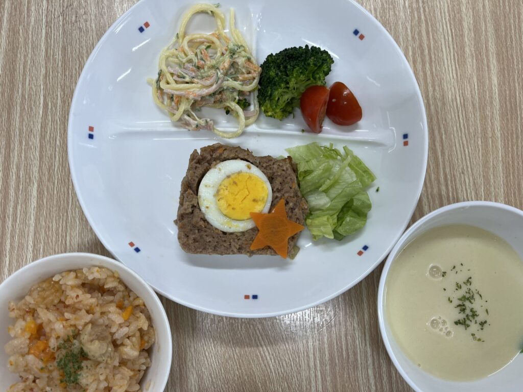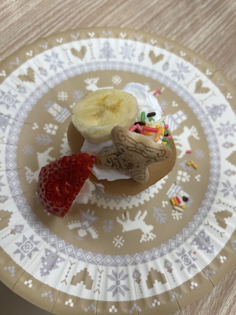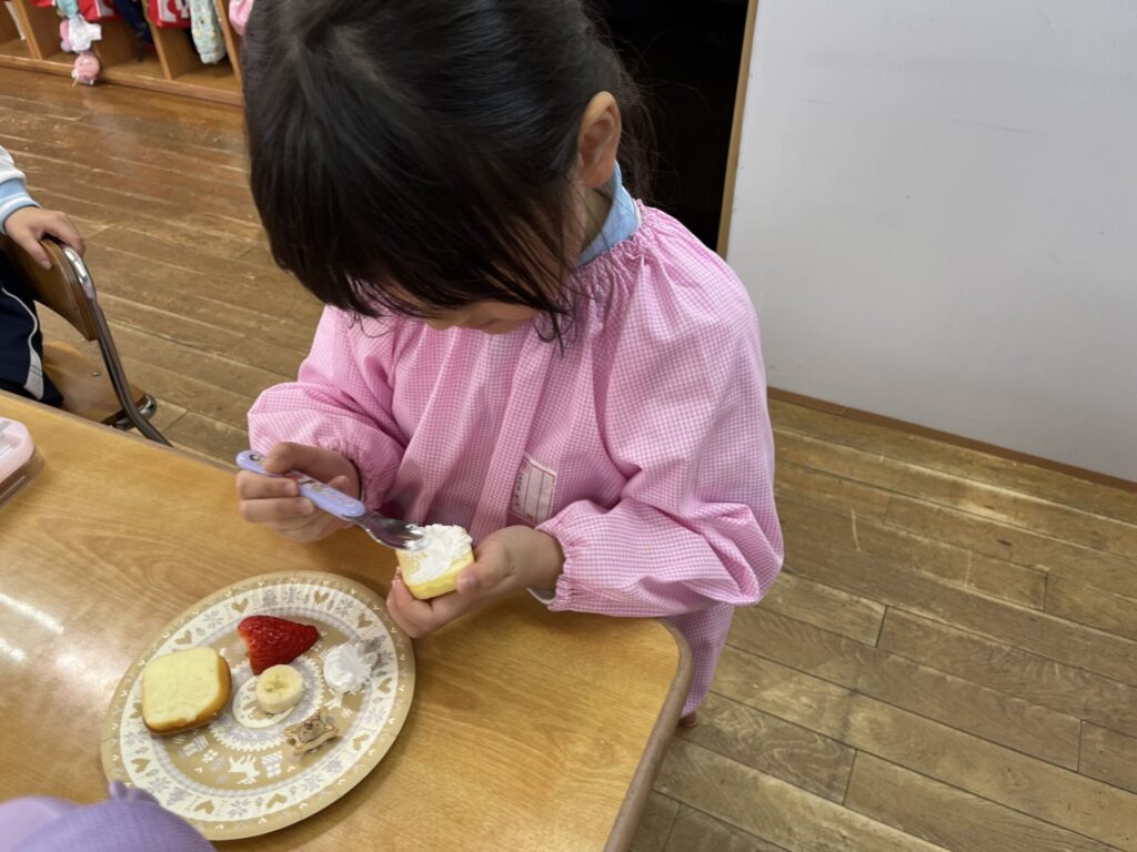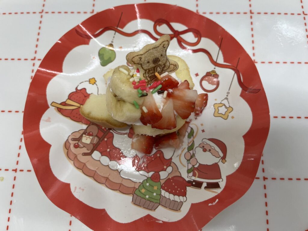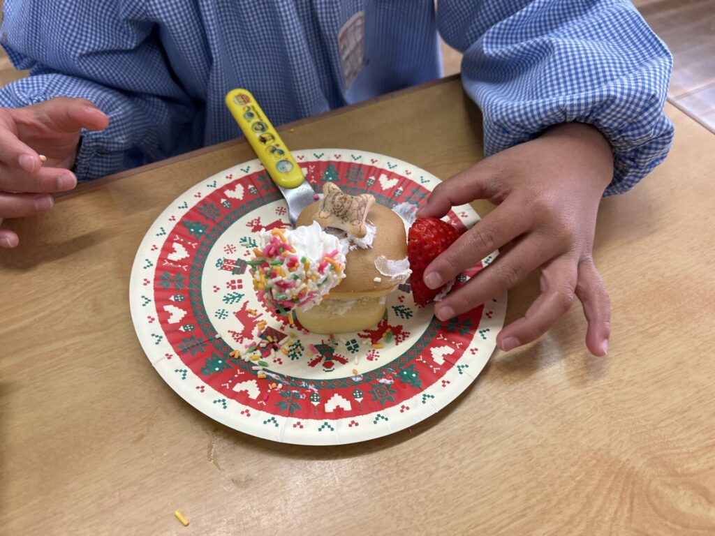 かんべ幼稚園 🎅クリスマス会給食🎄 2025.12.24 ≪12月24日(水)クリスマス会の献立≫・チキンライス・ミートローフ・スパゲティサラダ・さつま芋のポタージュ★クリスマス会デザート…クリスマスケーキ 2歳児 3~5歳児 はと組さんでは、クリスマスケーキのトッピングをしました❣生クリームを塗っていちごとコアラのマーチとトッピング用のカラフルチョコで思い思いに飾り付け🎵自分で作ったケーキはより特別でおいしかったようです😊 【はと組さん】 生クリームを塗って… トッピング🎵 3・4歳児クリスマスケーキ 2歳児クリスマスケーキ メリークリスマス🎅