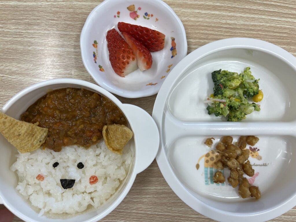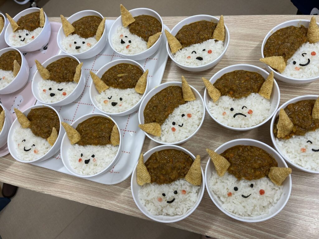 かんべ幼稚園 節分の日の給食👹 2026.02.03 ≪2月3日(火)節分の献立≫・鬼丼(ドライカレー)・豆じゃこ・ブロッコリーサラダ・いちご≪★手作りおやつ≫・節分クッキー(きなこ入り) 2歳児 鬼丼(3歳~5歳児) 節分クッキー(鬼の金棒に見えるかな?) おやつの節分クッキーには炒り大豆の代わりにきな粉が入っています👹今年も心の中の鬼さんを退治したみんなのもとにたくさんの福が舞い込みますように✨