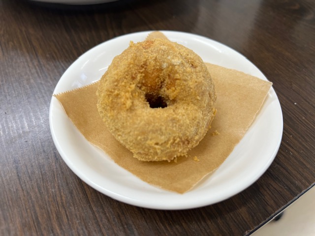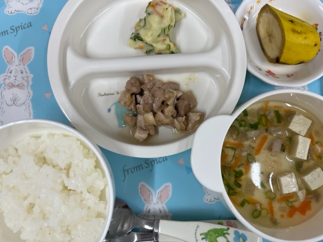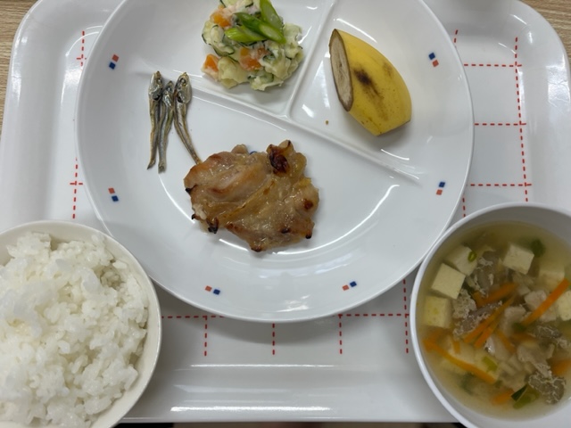 かんべ幼稚園 今日の給食🍩 2026.04.10 ≪4月10日(金)の献立≫・ご飯・マーマレードチキン・ポテトサラダ・沢煮椀・バナナ ★手作りおやつ…きな粉ドーナツ 2歳児 3歳~5歳児 きな粉ドーナツ